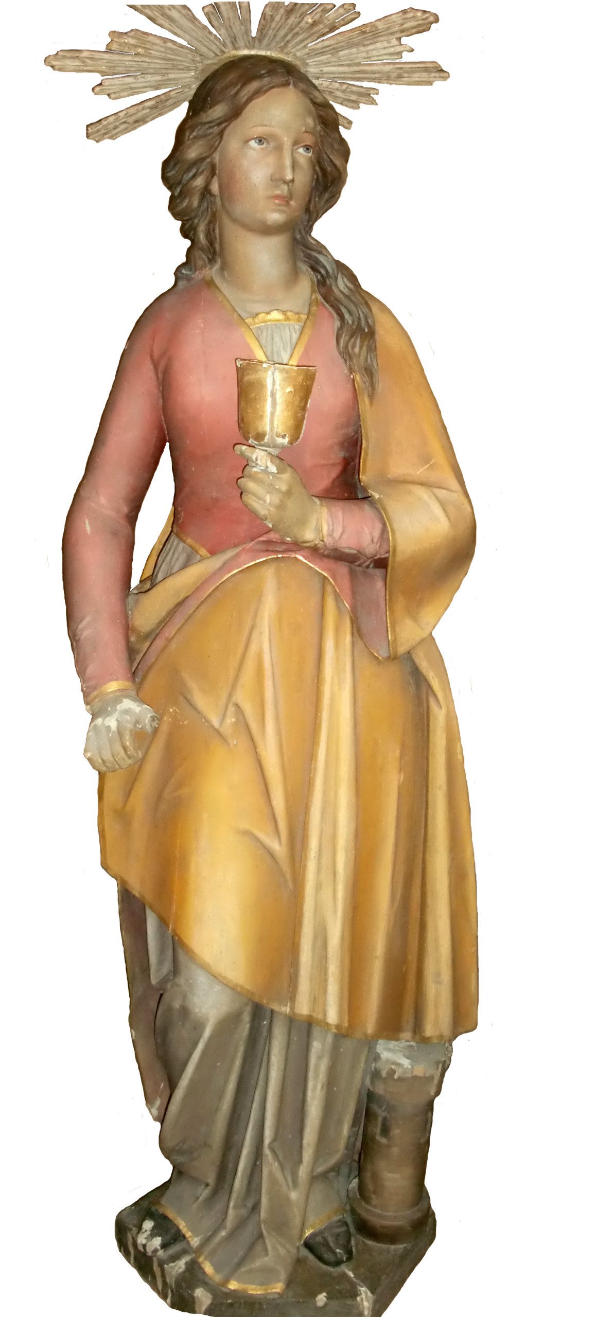Die jugendlich dargestellte hl. Barbara steht auf einer mehreckigen Plinthe. Sie trägt ein helles, bodenlanges Untergewand mit goldfarbenen Säumen. Darüber eine rote langärmelige Bluse. Über beides hat sie einen gelben Umhang geworfen. Den Kopf hat sie leicht nach links gedreht, ihr Blick ist nach oben gerichtet. Die Haare sind in gewellter Frisur nach hinten gekämmt, über ihrer linken Schulter liegt eine Strähne. Am Hinterkopf ist ein Strahlenkranz angebracht. Die Heilige trägt einen Kelch in der Linken, den rechten Arm ist nach unten gestreckt, die Finger der Hand sind gekrümmt, als hätte sie etwas gehalten. Neben ihrem linken Fuß steht auf der Standplatte ein Miniaturturm.