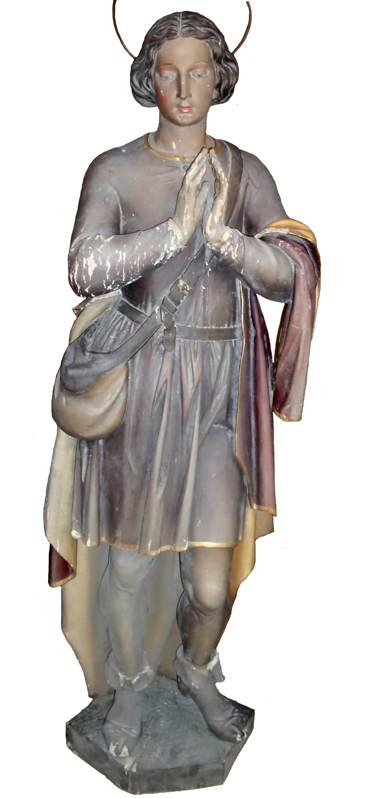 Die aufrecht im Kontrapost auf einer eckigen Plinthe stehende Figur hat Arme und Hände vor dem Oberkörper zur Gebetshaltung zusammengeführt. Wendelin ist mit einem knielangen, langärmeligen und in der Hüfte gegürtetem Untergewand bekleidet. Eine Chlamys (= Umhang) hängt lose am Körper herunter, ist rechts im Gürtel festgesteckt und über den linken Arm gelegt. Der Heilige trägt einen Beutel mit breitem Tragegurt quer um den Oberkörper geschlungen. Seine Gesichtszüge sind fein ausgearbeitet. Der Blick ist in andächtiger Manier nach unten gerichtet, die Augenlider sind halb geschlossen. Das kinnlange Haar rahmt den Kopf mittig gescheitelt und in lockeren Wellen. Ein schmaler, vergoldeter Reif ist als Heiligenschein am Hinterkopf befestigt.