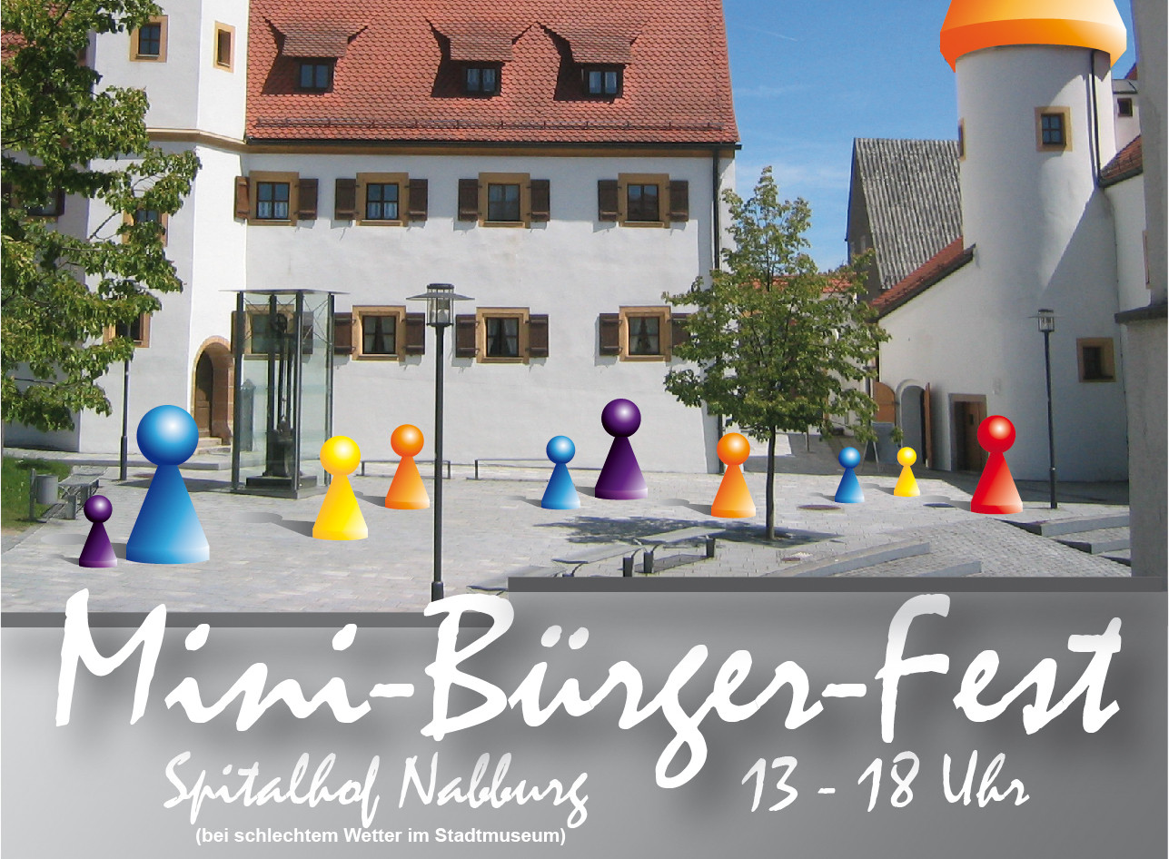 Auf geht es zum "Mini-Bürger-Fest" in den Nabburger Spitalhof! Je nach Wetterlage drinnen im Stadtmuseum Zehentstadel oder draussen ist es ein Fest für die ganze Familie, mit seinen abwechslungsreichen Geschicklichkeitsspielen, jeder Menge Spaß beim Sammeln von Punkten, einer Kunstaktion und dem Gewinnspiel mit zusätzlichem Rätselspaß und einer Familiensaisonkarte für das Freibad Nabburg-Perschen als Hauptpreis. Lustig-witzige Show-Einlagen und ein musikalisches Rahmenprogramm runden den bunten Nachmittag ab.
