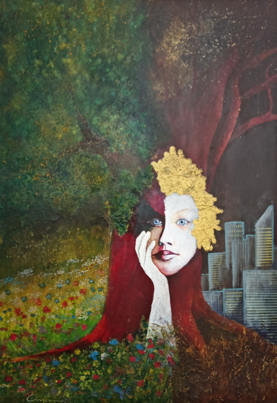 Auf den Acrylbildern steht Schönes und Schreckliches teils in krassem Gegensatz nebeneinander.